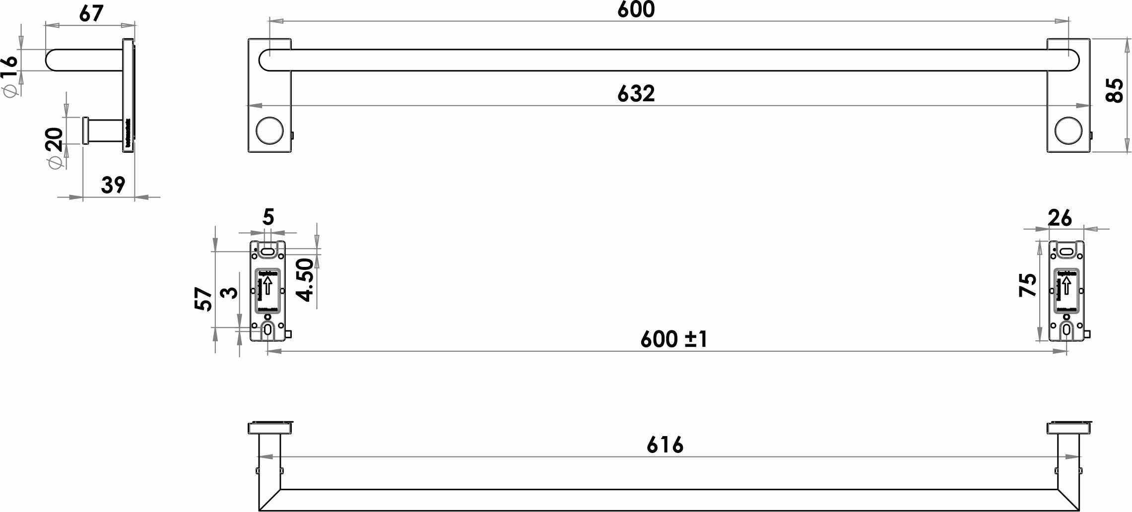SIGNA Porte-linge mural 60 cm chromé, avec deux crochets, saillie 6.7 cm, Montage Adesio pour collage ou perçage, incl. matériel de fixation (sans colle), qté d'adhésif de remplissage: 2x 1.4 ml SikaFast