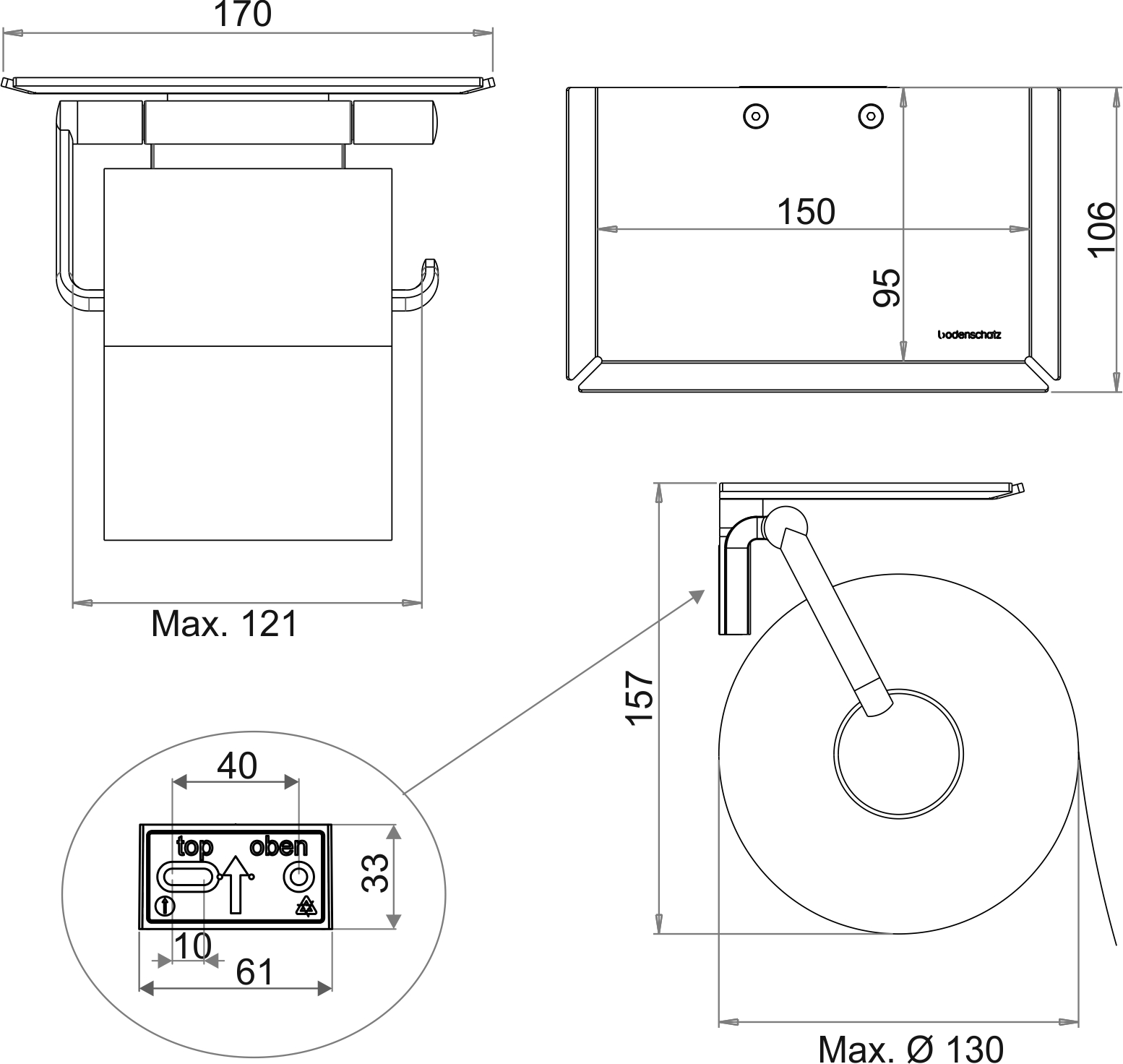 CHIC14 Portacarta con ripiano, bianco lunghezza 17 cm, sporgenza 13 cm, montabile a destra o sinistra. Montaggio incollaggio o foratura